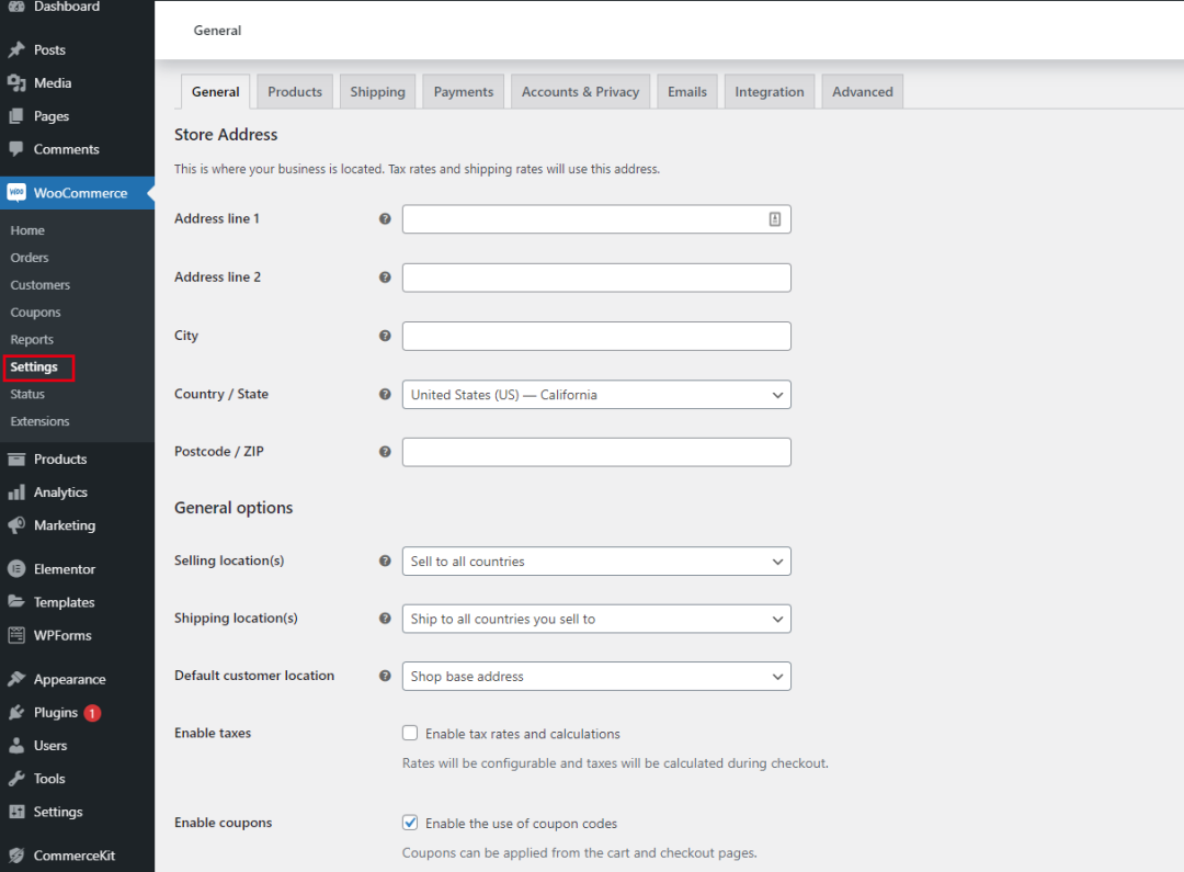菜单栏WooCommerce -> Settings -> General,设置店铺的发货地址。怎么填写看自己选择,可以填写中国地址或者国外地址。