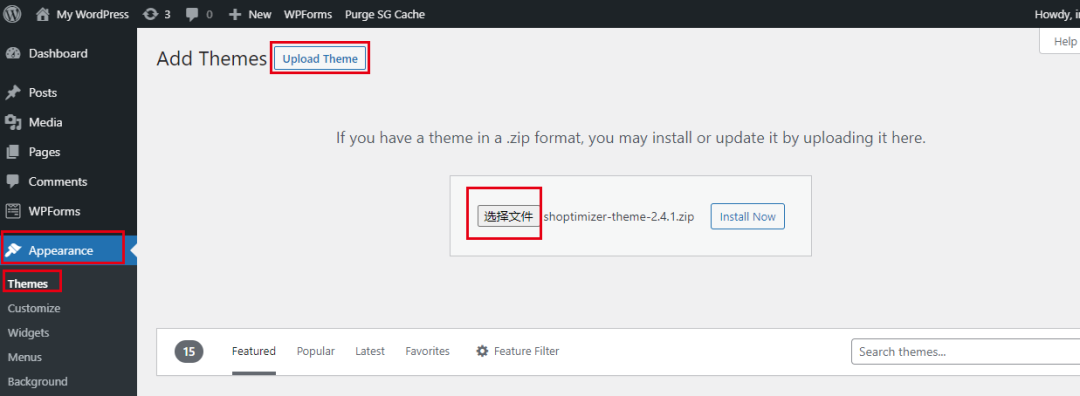 找到菜单栏Appearance -> Themes -> Add New -> Upload Theme ->选择文件,上传zip安装包,也就是主题模板文件。点击Install Now,如下图: