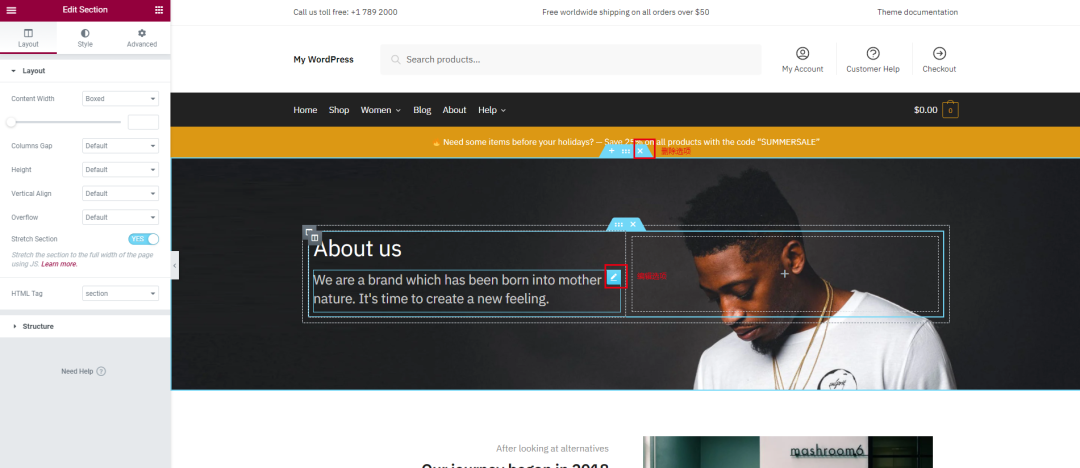 利用Elementor进行页面删除或者编辑。不想要的模块点删除,想要修改的内容点击铅笔图标,可以在内容框修改,或者在左边修改。