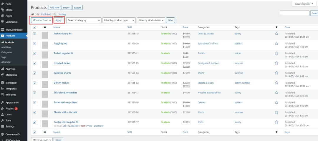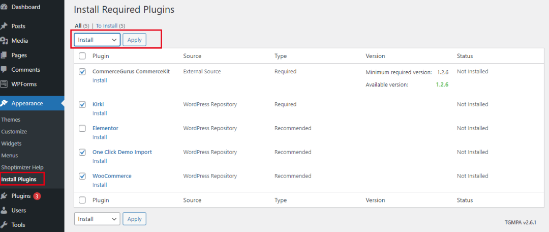 点击菜单栏Install Plugins,右边的插件除了Elementor全部勾选上,选择上方Install,点击Apply。