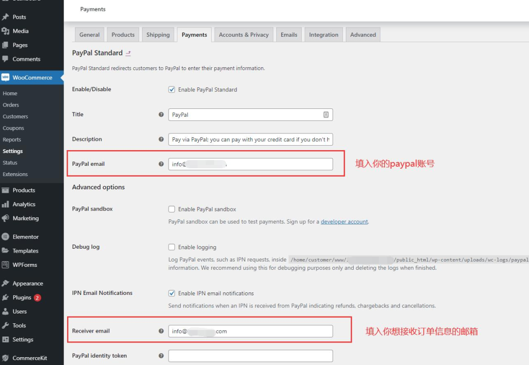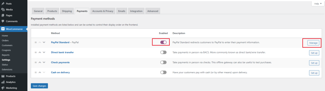 菜单栏WooCommerce -> Settings -> Payments,设置收款方式和账号。如果没有信用卡收款账号,可以先只选Paypal收款。其实Paypal也有信用卡收款方式,需要用到插件,后面我会讲到。