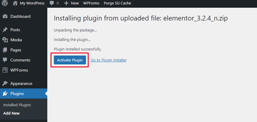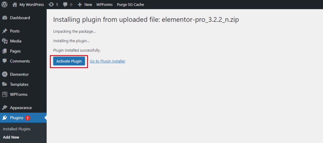 Elementor的文件安装好之后,继续上传并安装并激活Elementor Pro文件。