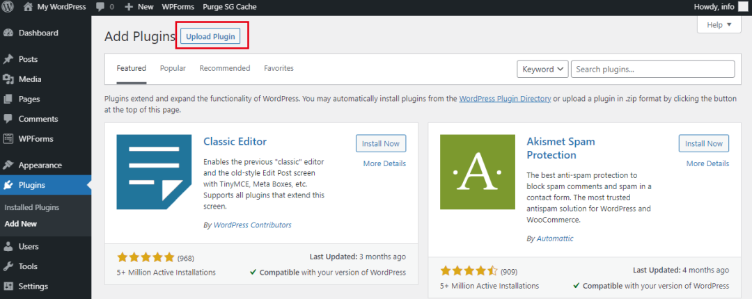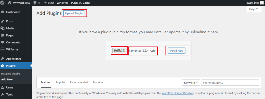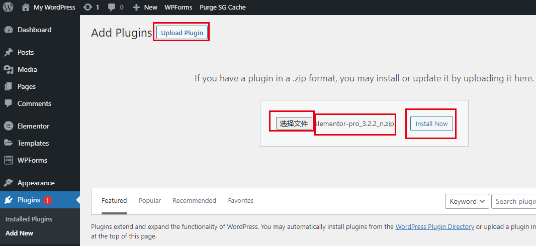 找到菜单栏Plugins ->Add New -> Upload Plugin -> 选择文件。