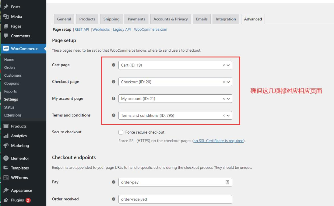 菜单栏WooCommerce -> Settings -> Advanced,这几项需要选择对应的页面,否则加购、结账时会出现无法正确跳转。