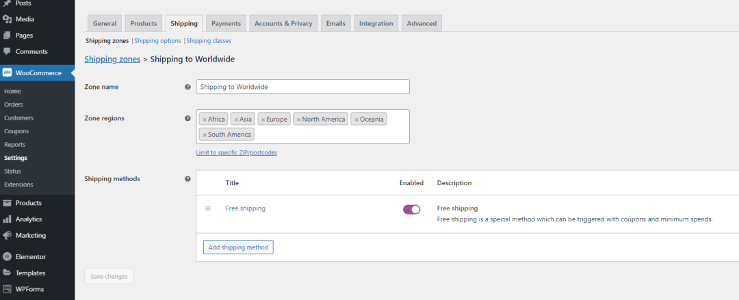 菜单栏WooCommerce -> Settings -> Shopping,设置自己销售的目标国家和运输方式。一般我都是选择包邮Free Shipping。