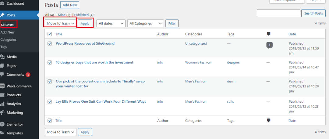 - 菜单栏Posts -> All Posts,删除默认文章。