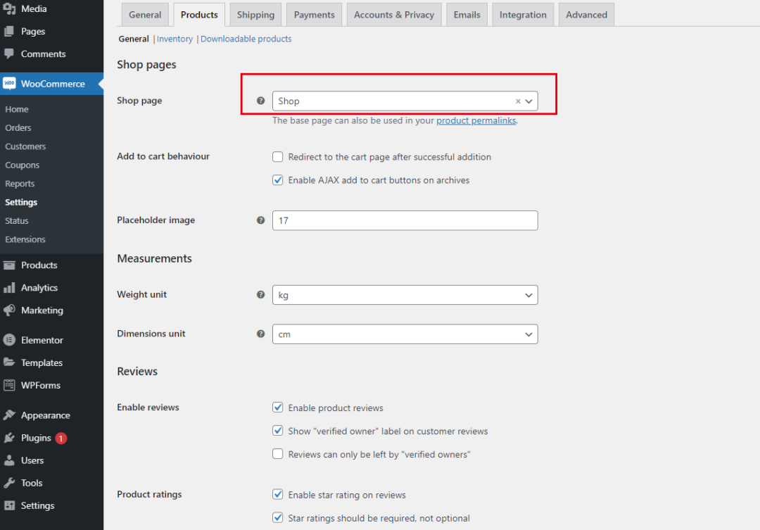 菜单栏WooCommerce -> Settings -> Products,Shop Page一般建议选择默认商店页面。