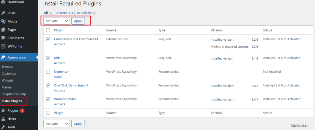 再次点击左边菜单栏Install Plugins,回到界面,勾选除Elementor外的插件。上方选择Activate,点击Apply激活插件。