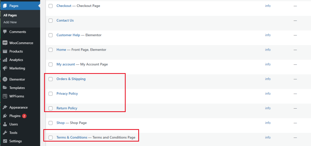 这里我重点先讲解如何添加服务条款、隐私条款、退款政策、订单和运输这几个页面。其他的页面我会在下一章节配合着网站前端设计一起讲解。