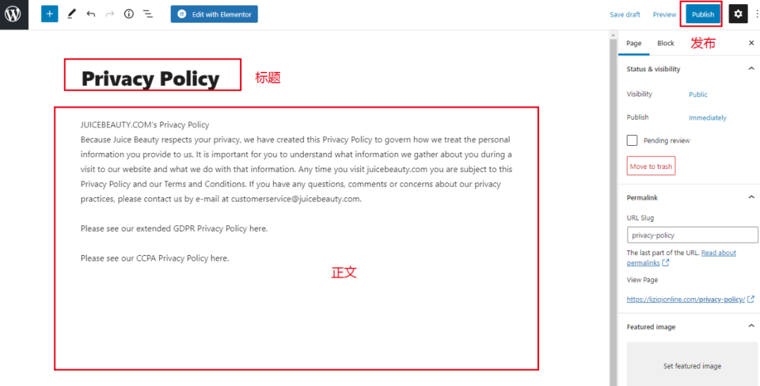 以下只以Privacy Policy页面为例,其他几个页面同理。记得修改内容里面的品牌名、网站、联系方式等信息,改成自己网站的!